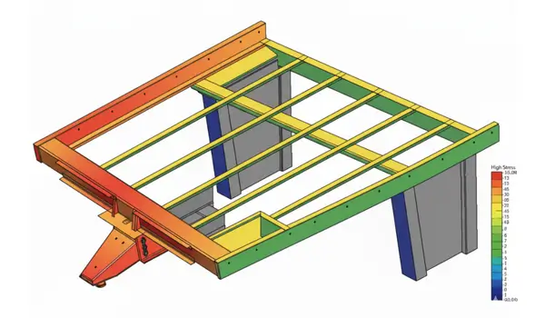 - Cross Member and Gusset Integration : Another key feature of the digital engineering approach is the ability to test the addition of cross members, gussets, and welds in the frame design. These features are critical for improving torsional stiffness and distributing forces more evenly across the upper deck frame. By evaluating these components through FEA, Caliber Technologies can determine the optimal placement and size of reinforcements, ensuring the frame is both strong and lightweight.